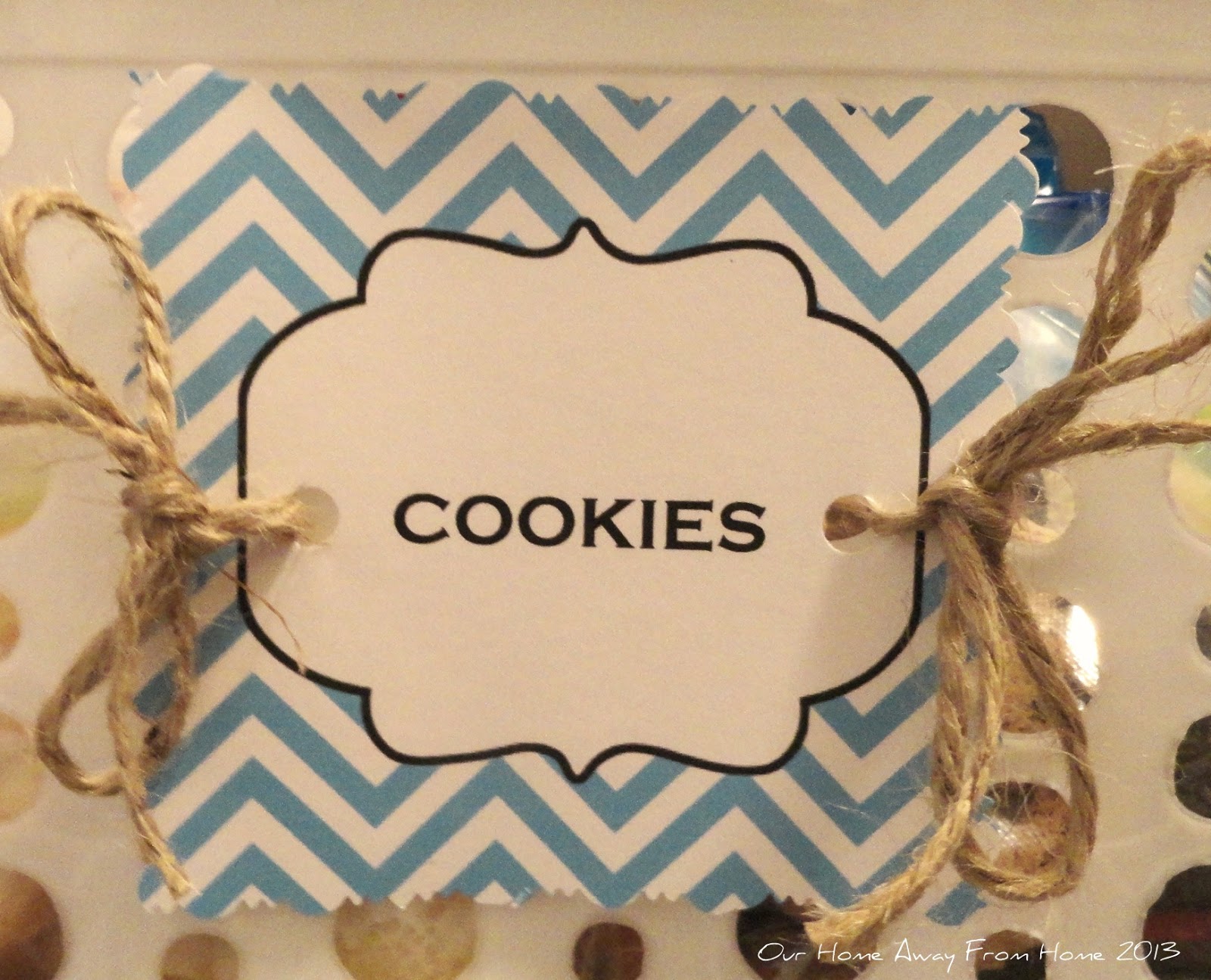 I purchased several plastic containers in a sage green color and white. When I got home, I downloaded some pretty blue Chevron design labels from Worldlabel which I cut with my pattern scissors to make them a little prettier.